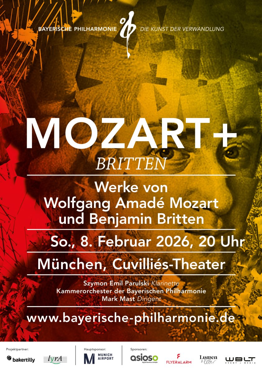 In Erinnerung an den Geburtstag von Wolfgang Amadé Mozart am 27. Januar 1756 wurde die Reihe »Mozart+« ins Leben gerufen. Jährlich wird dabei das musikalische Schaffen Mozarts einem Komponisten des 20. Jahrhunderts oder der Gegenwart gegenübergestellt und in einen spannenden Dialog gebracht. 2026 steht Benjamin Britten (1913 – 1976) anlässlich seines 50. Todestags im Fokus als Mozarts »Gegenüber«. Einer der herausragenden jungen Talente, der polnische, hochbegabte LYRA-Stipendiat Szymon Emil Parulski, begeistert mit virtuoser Klarinettentechnik und außergewöhnlicher musikalischer Reife. Gemeinsam mit dem Kammerorchester der Bayerischen Philharmonie unter dem Dirigat von Mark Mast präsentiert er folgendes Programm: