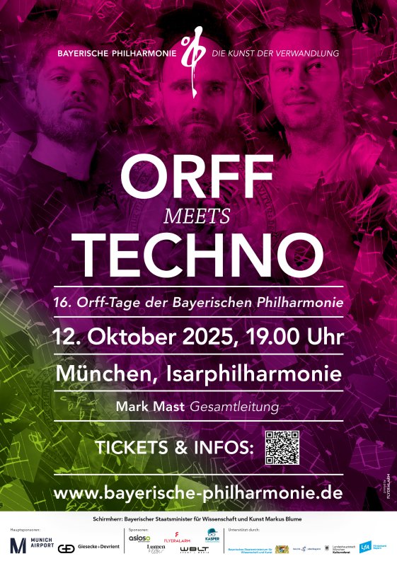 Das hat es so noch nie gegeben: Carl Orffs epochale»Carmina Burana« trifft auf pulsierende Techno-Rhythmen – live, analog und ohne elektronische Tricks. Mit »ORFF meets TECHNO« setzt die Bayerische Philharmonie ein musikalisches Statement: Hier verschmilzt die archaische Kraft von Orffs Chorklang mit der hypnotischen Energie modernen Sounds – ein Klangexperiment, das seinesgleichen sucht. In dieser weltweit einzigartigen Crossover-Produktion treffen sich Klassik und Techno auf Augenhöhe: Das preisgekrönte Techno Piano Trio »LBT« erzeugt elektronische Grooves ganz ohne Computer – rein akustisch mit Klavier, Kontrabass und Schlagzeug. An ihrer Seite: ein Solisten-Ensemble von internationalem Rang – vielfach ausgezeichnet, mit renommierten Stimmen und auf führenden Konzertbühnen zu Hause. Ergänzt wird die Besetzung durch das Klavierduo und Percussion-Ensemble der Bayerischen Philharmonie sowie dem Chor und Kinderchor der Bayerischen Philharmonie. Dirigiert und moderiert wird das außergewöhnliche Klangexperiment von Mark Mast – Intendant und Chefdirigent der Bayerischen Philharmonie.